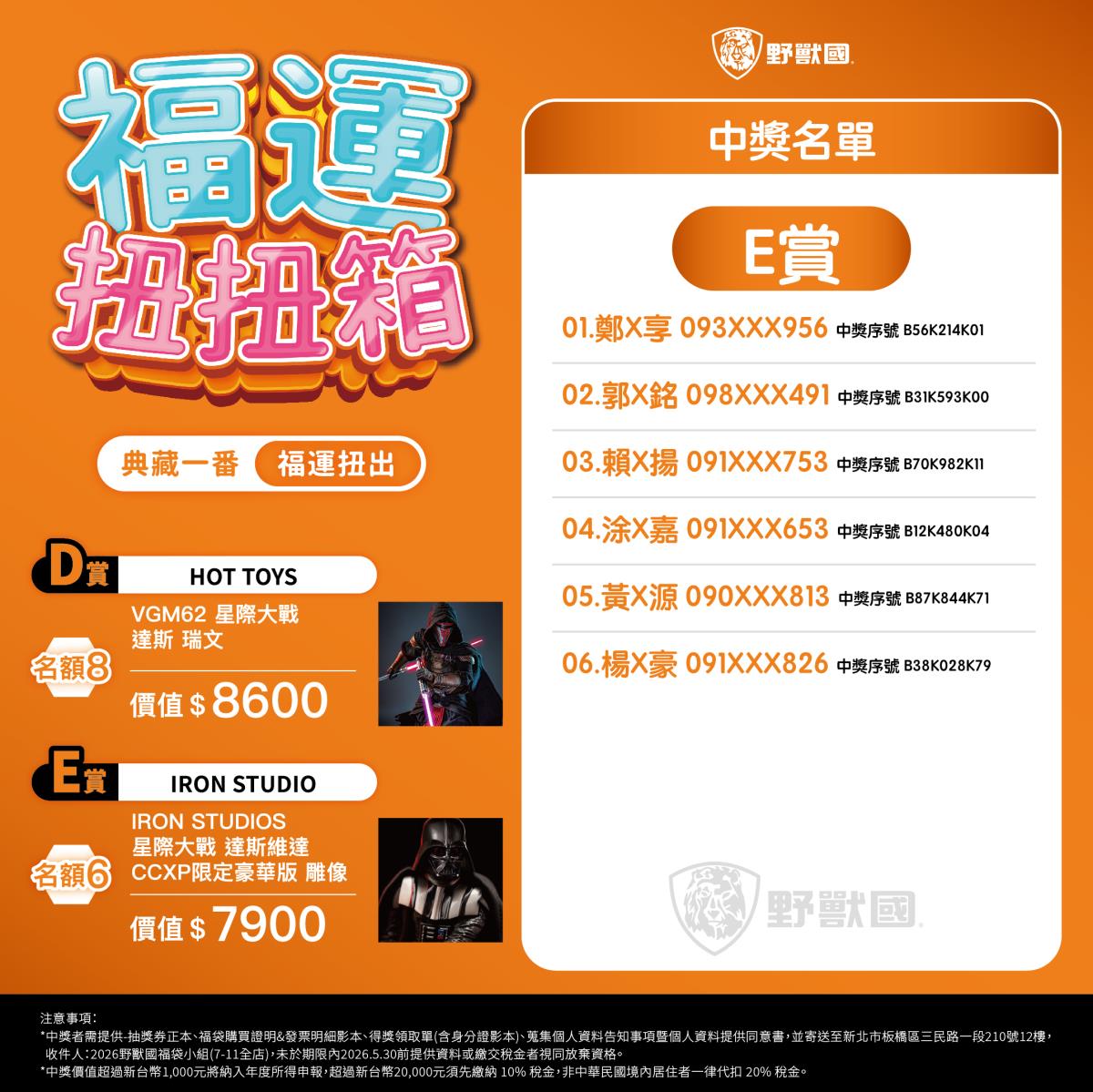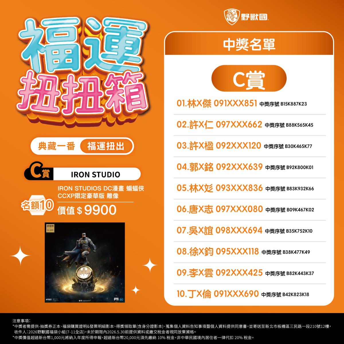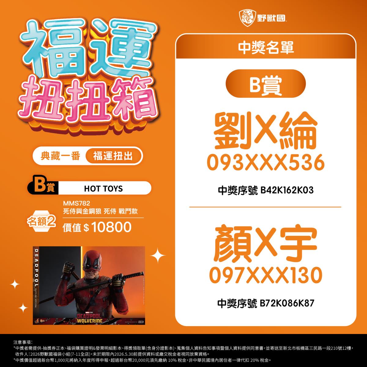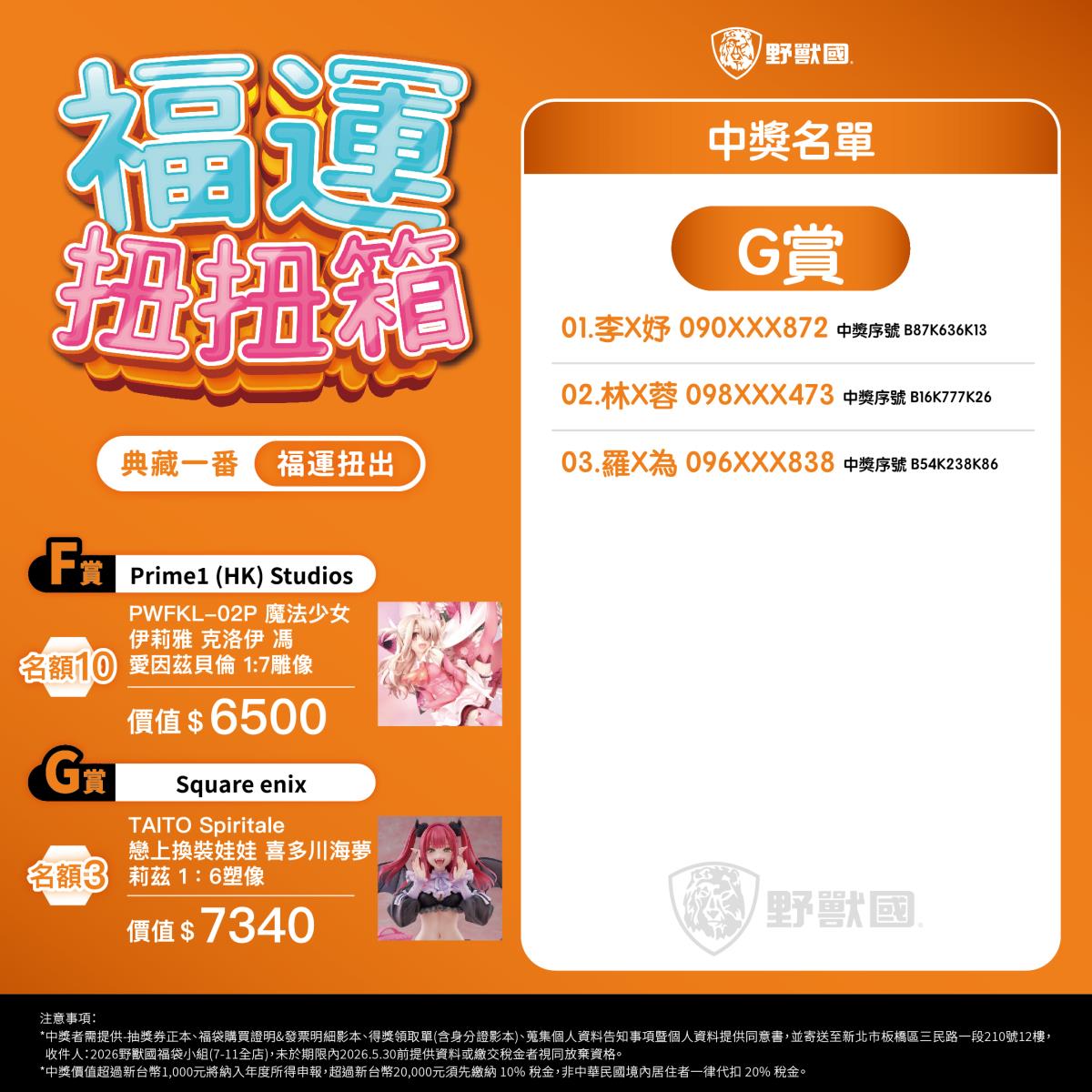 - 須於規定期限內完成領獎相關文件寄送(地址:新北市板橋區三民路一段210號12樓,收件人:2026野獸國福袋小組)。