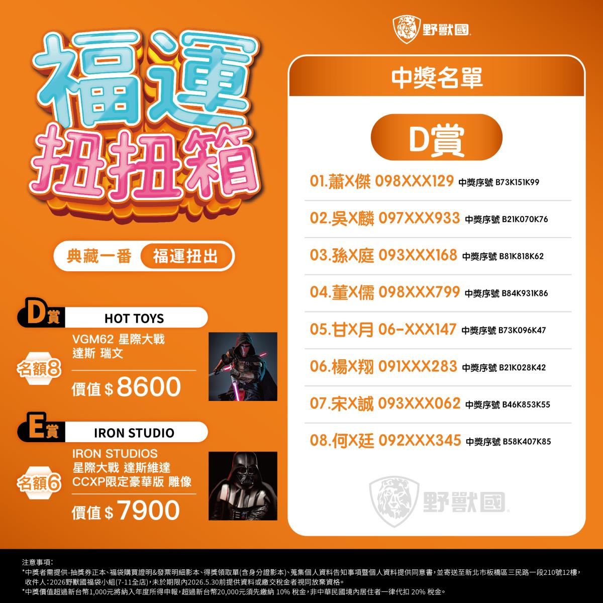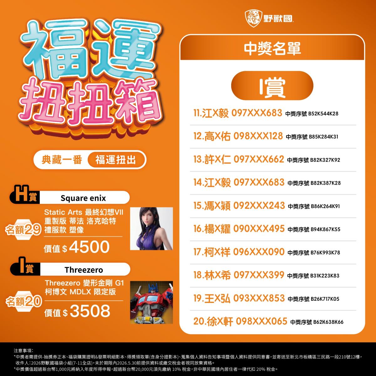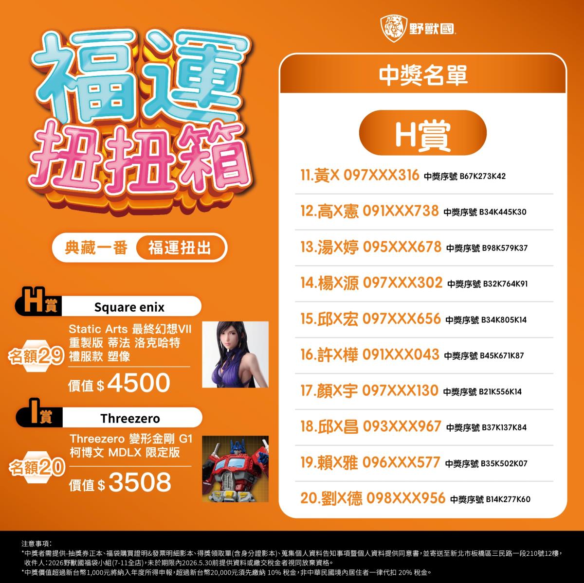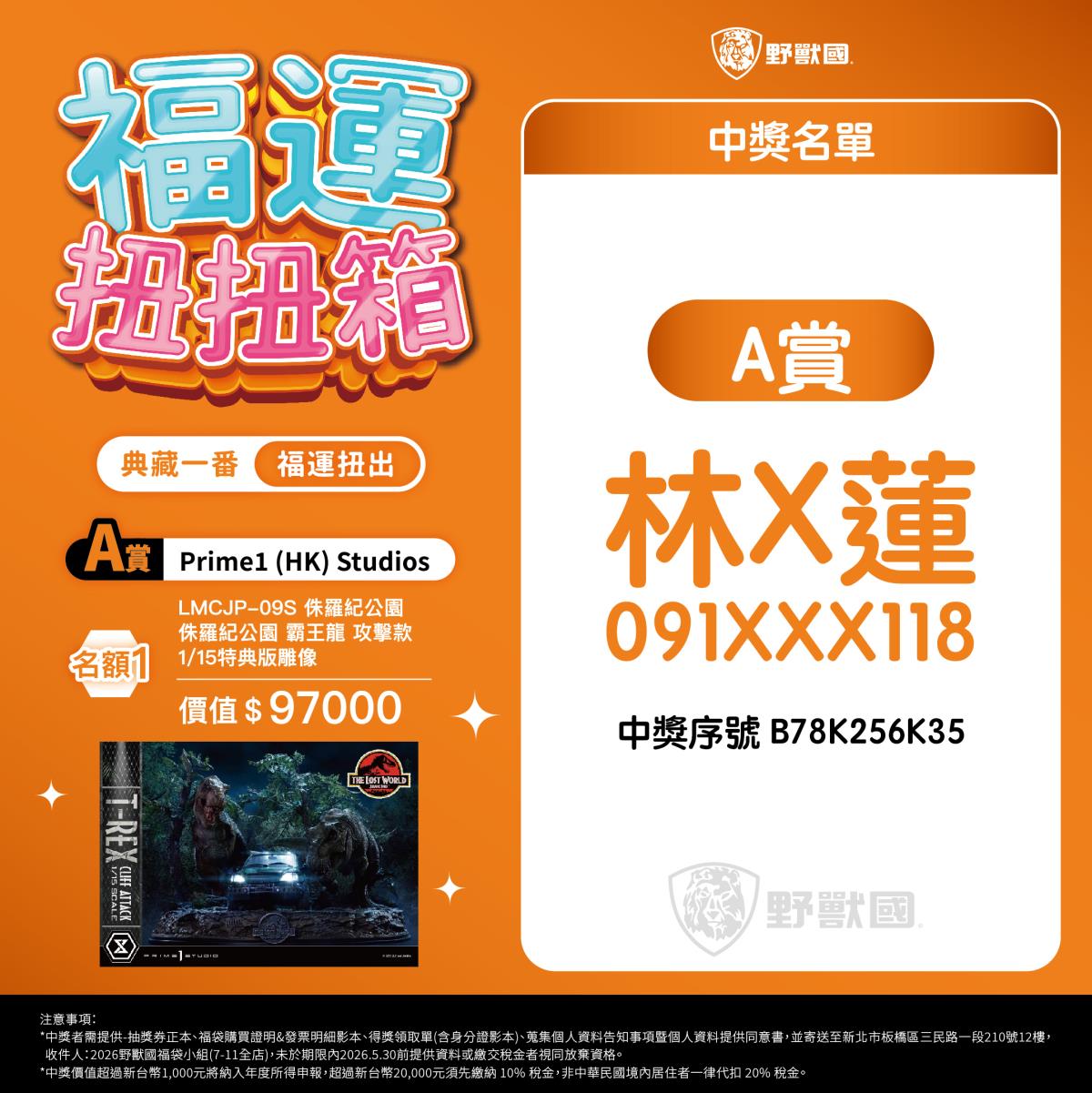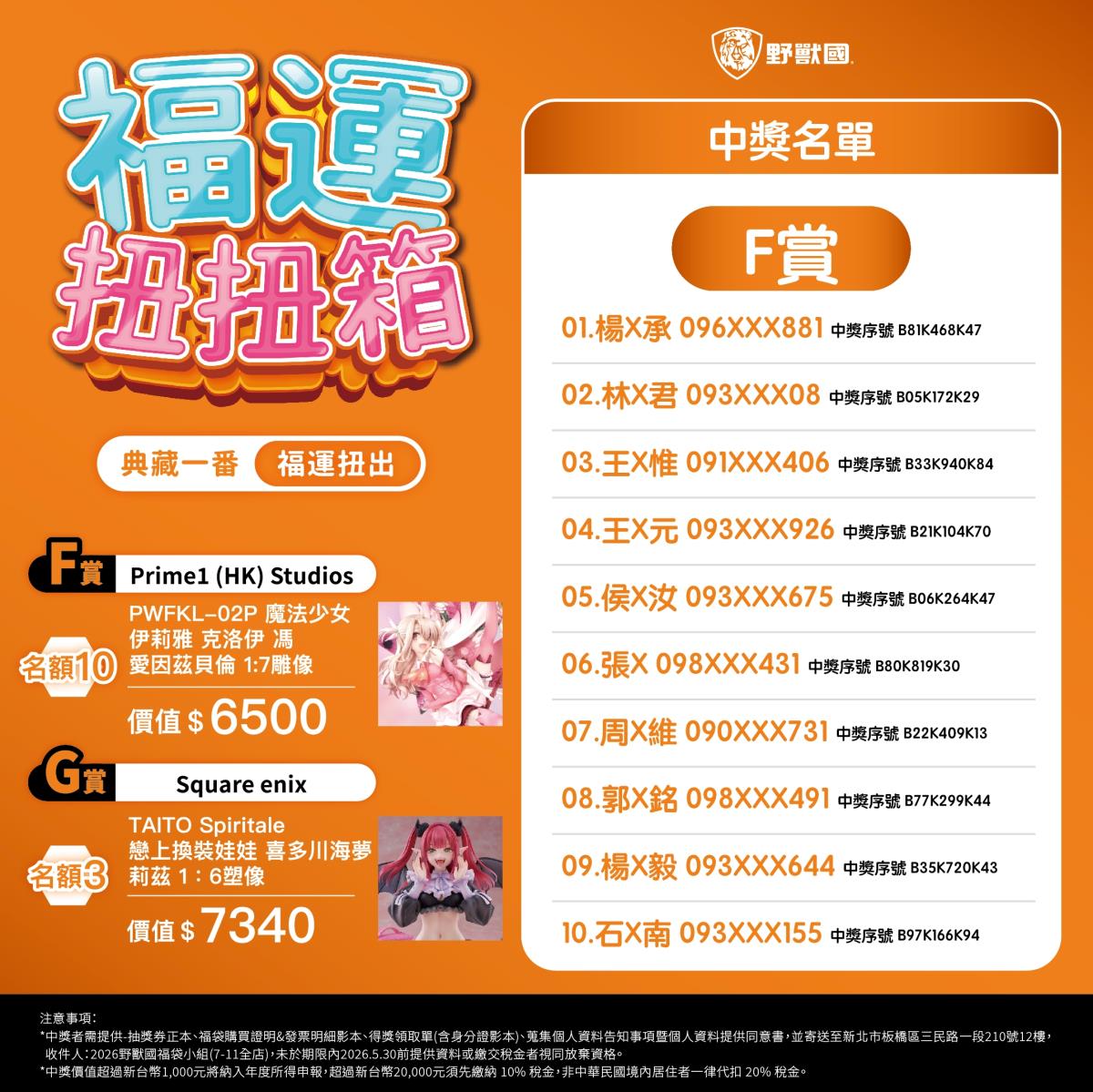 - 須於規定期限內完成領獎相關文件寄送(地址:新北市板橋區三民路一段210號12樓,收件人:2026野獸國福袋小組)。